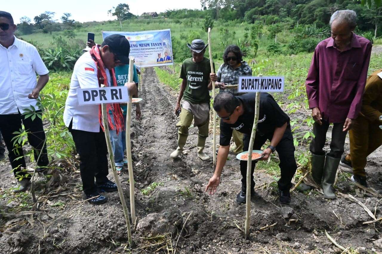 Oelamasi, TIRILOLOKNEWS.COM || REGIONAL – Bupati Kupang, Yosef Lede, bersama Wakil Ketua Komis IV DPR RI, yang juga ketua DPW PAN NTT, Ahmad Yohan, melakukan penanaman jagung musim tanam II, di lahan milik kelompok taruna tani Simple Man, di Desa Silu, Kecamatan Fatuleu, Selasa (29/4/2025). Dalam kesempatan tersebut Ahmad Yohan juga menyalurkan bantuan berupa motor air, bibit, dan peralatan pertanian lainnya.
