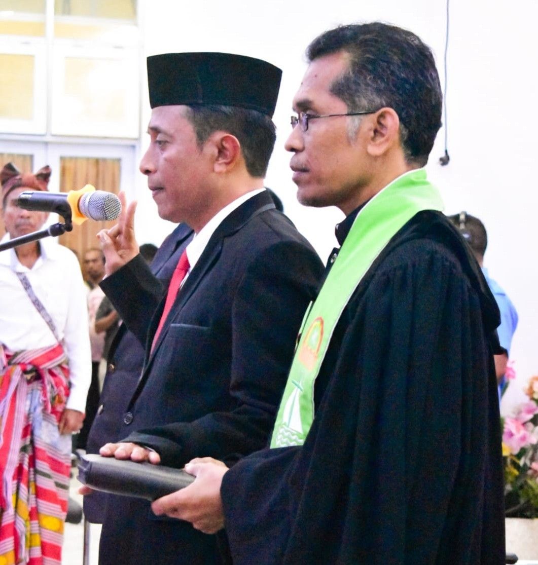 Acara pengangkatan sumpah/ janji Sekda Mateldius Sanam dihadapan Bupati Yosef Lede, di berkati Tuhan Yang Maha Kuasa melalui tangan Yang Mulia Uskup Agung Mgr.Hironimus Pakaenoni, bersama rohaniawan pendamping Pendeta Jesmarlianus Djo Naga dengan para Saksi diantaranya Staf Ahli Gubernur NTT Petrus Seran Tahuk dan Ady Mandala.
