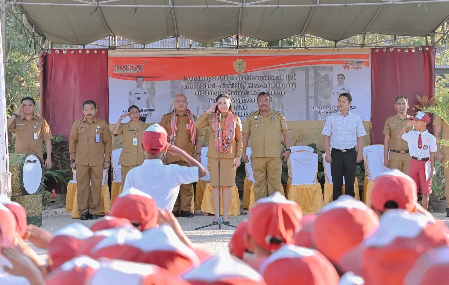 Kota Kupang, TIRILOLOKNEWS.COM || REGIONAL – Wakil Wali Kota Kupang, Serena Cosgrova Francis, S.Sos., M.Sc., bertindak sebagai pembina upacara bendera sekaligus melaunching program Self Defense (Pengamanan Diri) bagi siswi-siswi SD/MI se-Kota Kupang. Kegiatan berlangsung di halaman SD Inpres Naimata, Senin (4/8/2025) pagi, dihadiri oleh Kepala Dinas Pendidikan dan Kebudayaan Kota Kupang, Drs. Dumuliahi Djami, M.Si., Camat Maulafa, Matheus A.B.H. Da Costa, S.Sos., M.Si., Lurah Naimata, Hendrikus Banunaek, S.H., M.Hum., Kepala UPTD SD Inpres Naimata, Theresia Peni Leuwayang, S.Pd., dan para Kepala SD/MI se-Kota Kupang. Hadir pula Ketua Komite SDI Naimata, Siprianus Damai Nar, S.H., para guru, tenaga kependidikan, orang tua siswa serta siswa-siswi SDI Naimata.