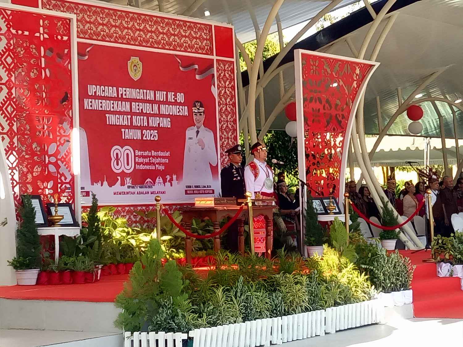 Ketua DPRD Kota Kupang, Richard E. Odja, membacakan teks proklamasi di hadapan peserta upacara yang terdiri dari anggota DPRD, TNI, Polri, pimpinan perangkat daerah, camat, lurah, RW, RT, serta para undangan lainnya.