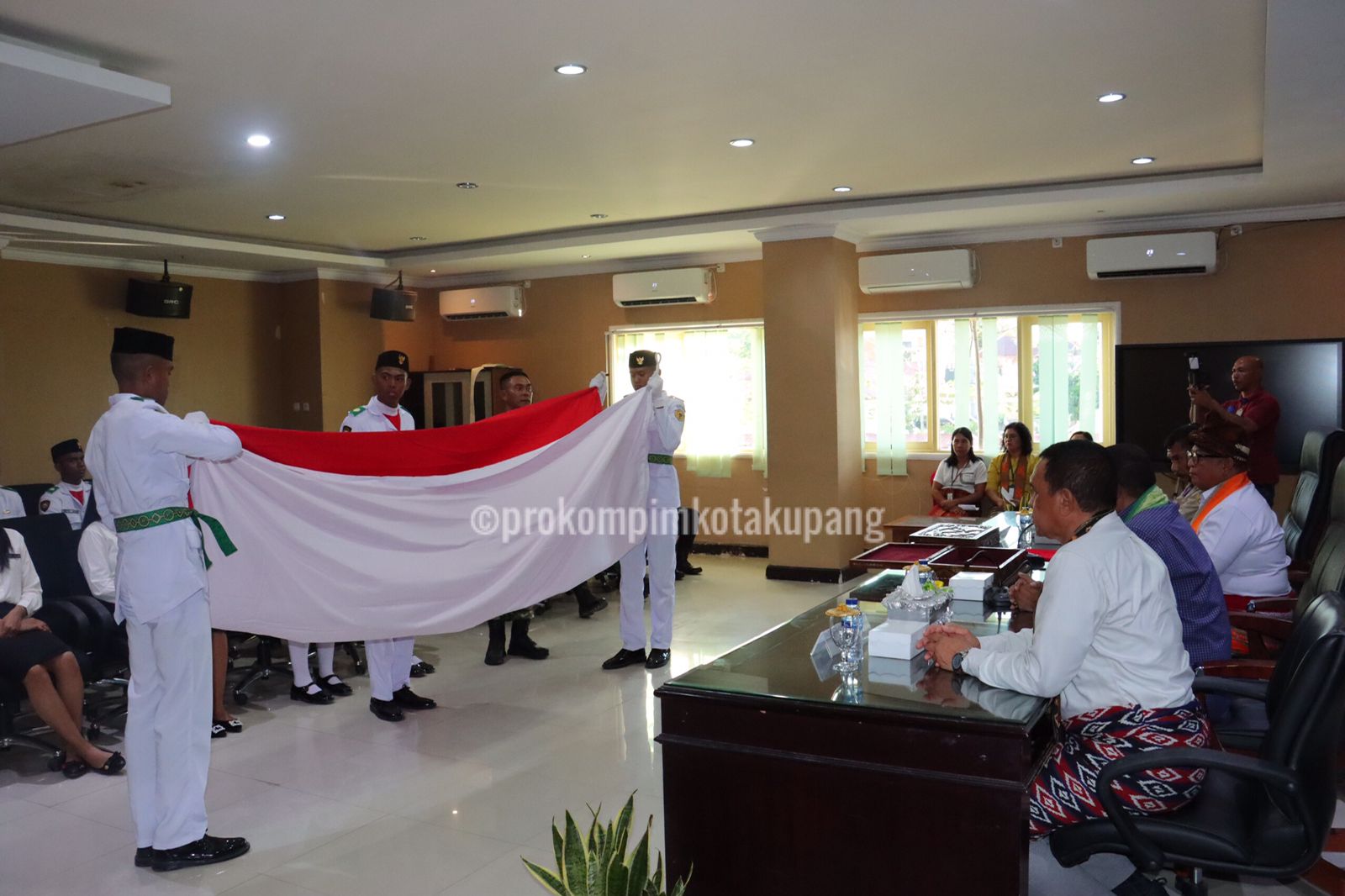 Kota Kupang, TIRILOLOKNEWS.COM || REGIONAL – Penjabat Wali Kota Kupang, Fahrensy Priestley Funay,SE.,M.Si., menghadiri acara Acara Lipat Duplikat Bendera Merah Putih Jelang HUT RI ke-79. Lipat bendera oleh Paskibraka Kota Kupang berlangsung di Aula Garuda Kantor Wali Kota Kupang, Kamis (16/8).